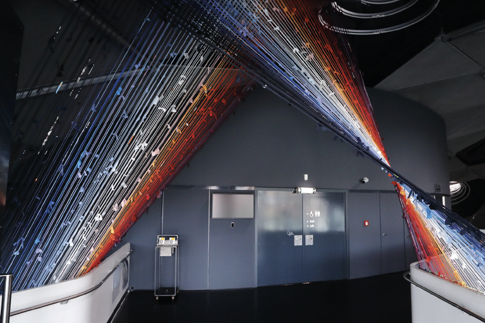 Wenngleich immer wieder verändert und neu adaptiert sind islamische Architektur und Kunst in ihren Arbeiten inhaltliche und ästhetische Referenz: sei es in Form der einzelnen Bestandteile der Teppichmuster am Boden, den aus Secondhand-Textilien erstellten Stoffdesigns für die Zelte des UNHCR oder in den den Rosettenfenstern von Moscheen bzw. gotischen Kirchen nachempfundenen, geometrischen Ornamenten, die der rundum verglasten Aussichtsplattform eine religiöse Anmutung geben. Die Künstlerin hat dafür Tausende, rot-blaue 3D-Brillen kunstvoll arrangiert, die an das US-amerikanische Blockbuster-Kino der 1980er-Jahre und Filme wie Der weiße Hai erinnern.